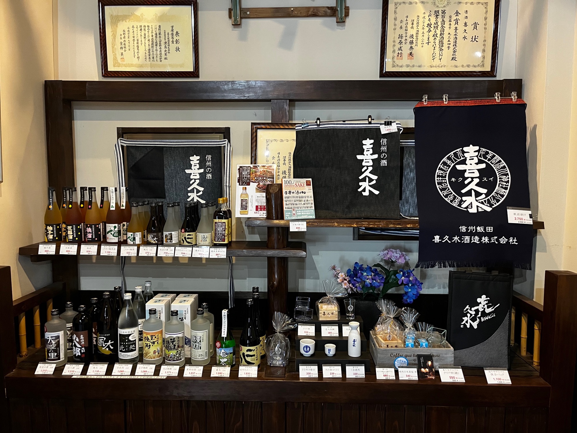 飯田市唯一の酒蔵「喜久水酒造」の直売店です。日本酒・焼酎・果実酒(シードル)など原料には地元の農産品にこだわった酒造りを行っています。米は地元の契約農家で生産された酒造好適米「たかね錦」を使い、水には中央アルプス山系の伏流水をくみ上げ使用しています。他にも南信州産のりんごを使ったシードルなど販売中
